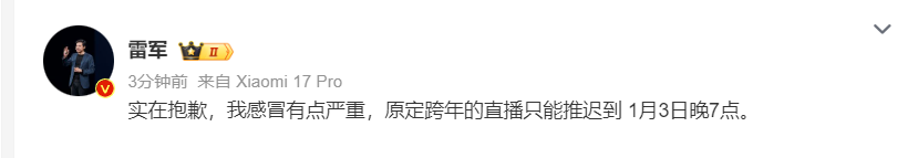 12月31日炒股配资代理,雷军发文:实在抱歉,我感冒有点严重,原定跨年的直播只能推迟到 1月3日晚7点。