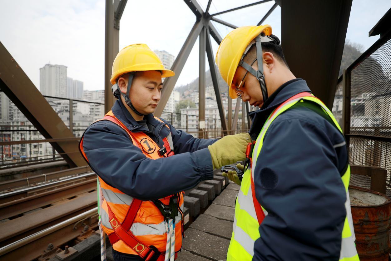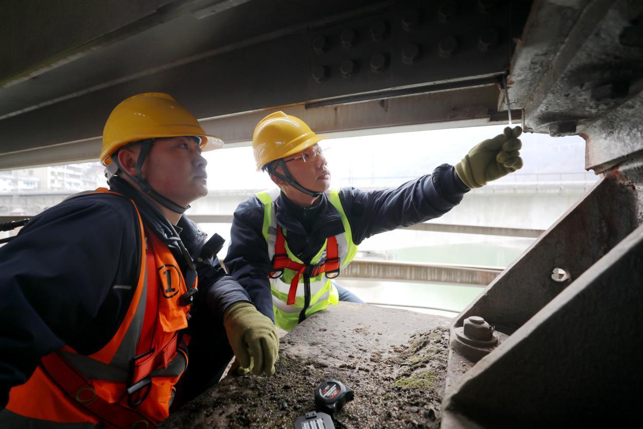 “手扶稳、脚踩实,注意安全!”王拯顺着检查梯下桥时,不忘大声提醒身后的工友。检查钢梁桥,是桥隧工最险、最难的活之一。作业人员要沿着狭窄陡峭的检查梯,小心翼翼下到距汉江水面100米高的桥墩作业面,在仅3平方米的狭小空间里,贴着围栏逐项检查支座位移、锚栓松动、垫石空响等每一处细节。