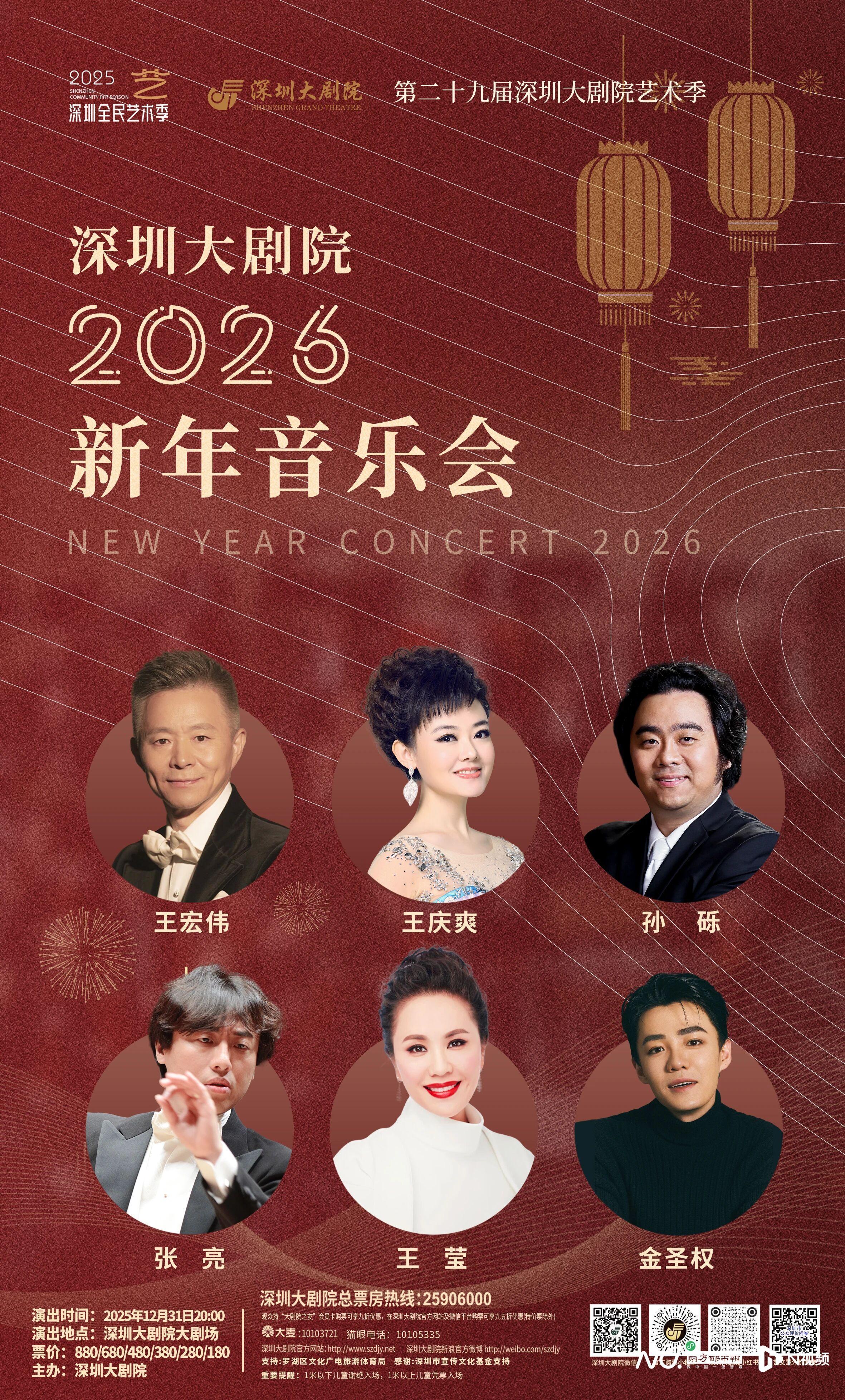 2026 跨年之夜,深圳大剧院邀请著名歌唱家王宏伟、王庆爽、孙砾、王莹,青年音乐剧演员金圣权联袂著名指挥家张亮与深圳大剧院爱乐乐团,共同为观众献上深圳大剧院2026新年音乐会。